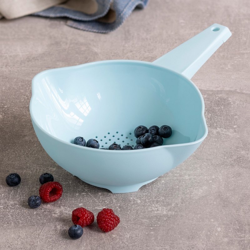 - Het vergiet heeft een opening in het handvat om hem op te kunnen hangen.